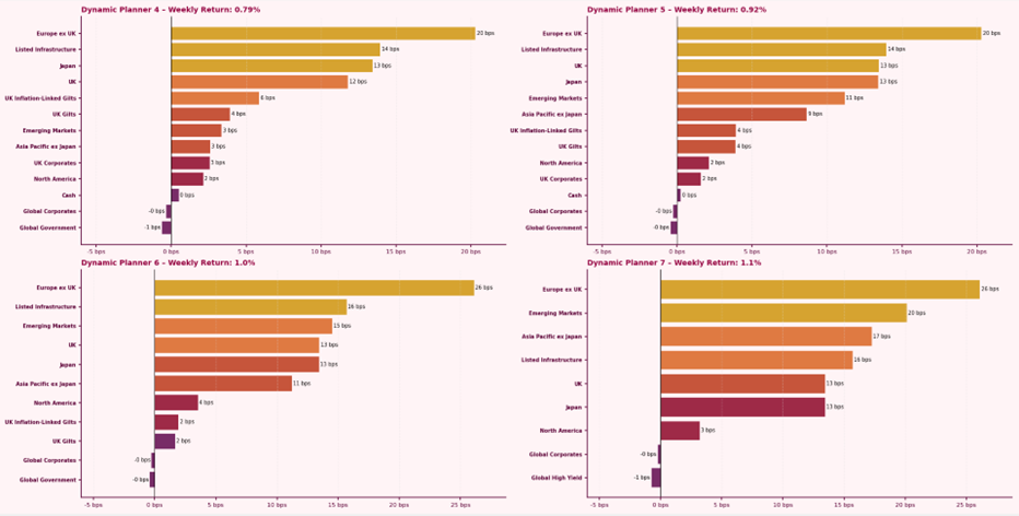 Each week Abhimanyu Chatterjee, Chief Investment Strategist at Dynamic Planner provides a clear and concise overview of how our Benchmark Allocations performed, its key drivers and trends along with notable movements within the portfolio. Designed to support you and keep you informed of how our portfolios have been performing and providing information you can discuss with your clients.