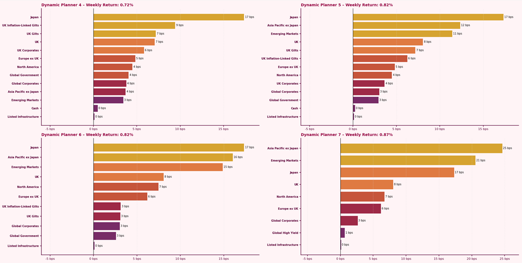 The Dynamic Planner Benchmarks delivered positive returns last week, ranging from 0.7% to 0.9%. Global risk sentiment improved following the previous week’s pullback. Japanese equities led performance, supported by strong corporate earnings, yen weakness, and expectations of further fiscal stimulus, though the Bank of Japan cautioned that parts of the market may be overheating amid heavy inflows.