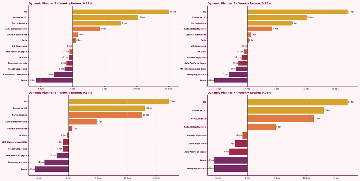Dynamic Planner Portfolios achieved modest returns last week, ranging from 0.26% to 0.34%. UK equities were the standout contributors, benefitting from relative US dollar weakness, which in turn favoured exporters and bolstered the FTSE 100. This surge, led by Pharmaceuticals, came as a result of tariff headlines which targeted US drug imports, shifting profit expectations outside of the US.