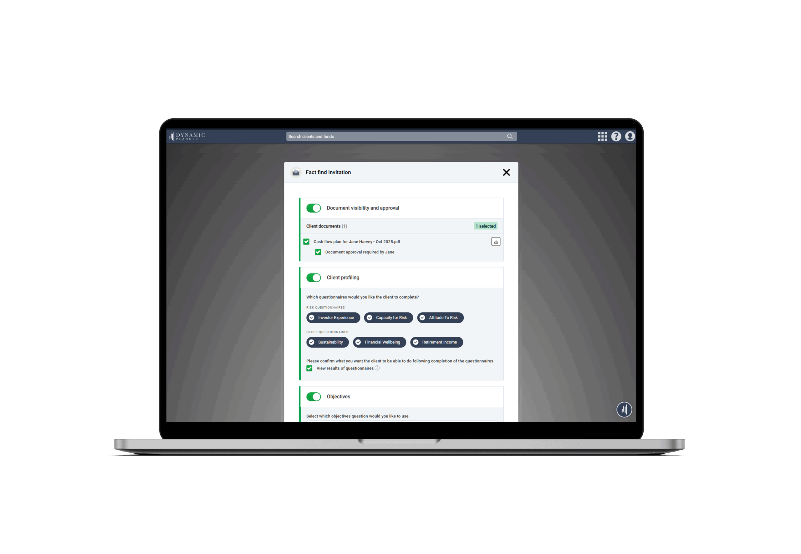 - Immediate feedback when your client completes a questionnaire, with the results instantly available in Dynamic Planner for use in Profiling, Review and Cash Flow Reports